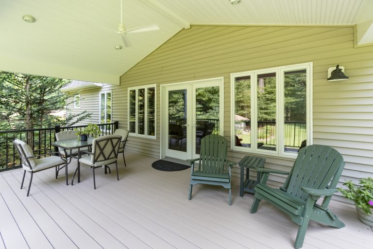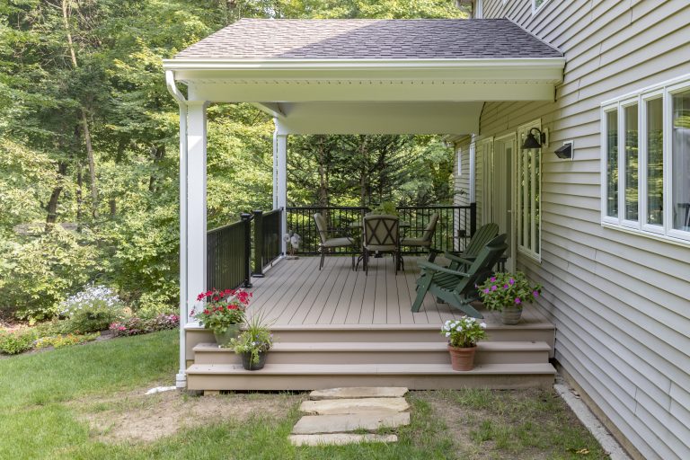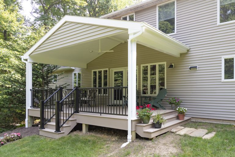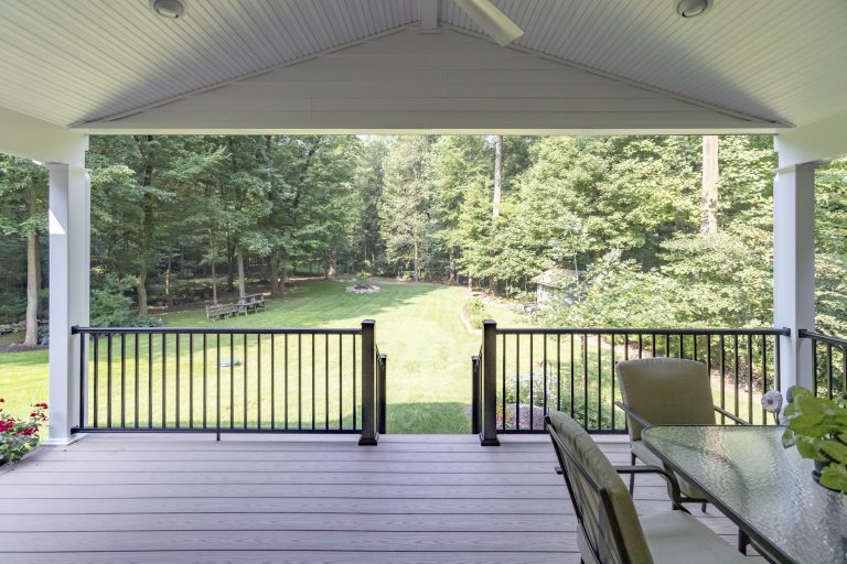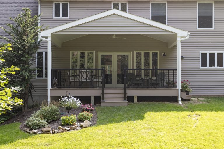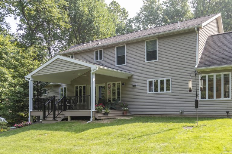 This gorgeous outdoor living space addition included a new 12 x 20 Azek composite deck in a Brownstone finish. The custom-built roof over the deck expands the shaded area, adds privacy, and protects the area from the weather. This space is so inviting and makes the backyard a desired place to be throughout various seasons!