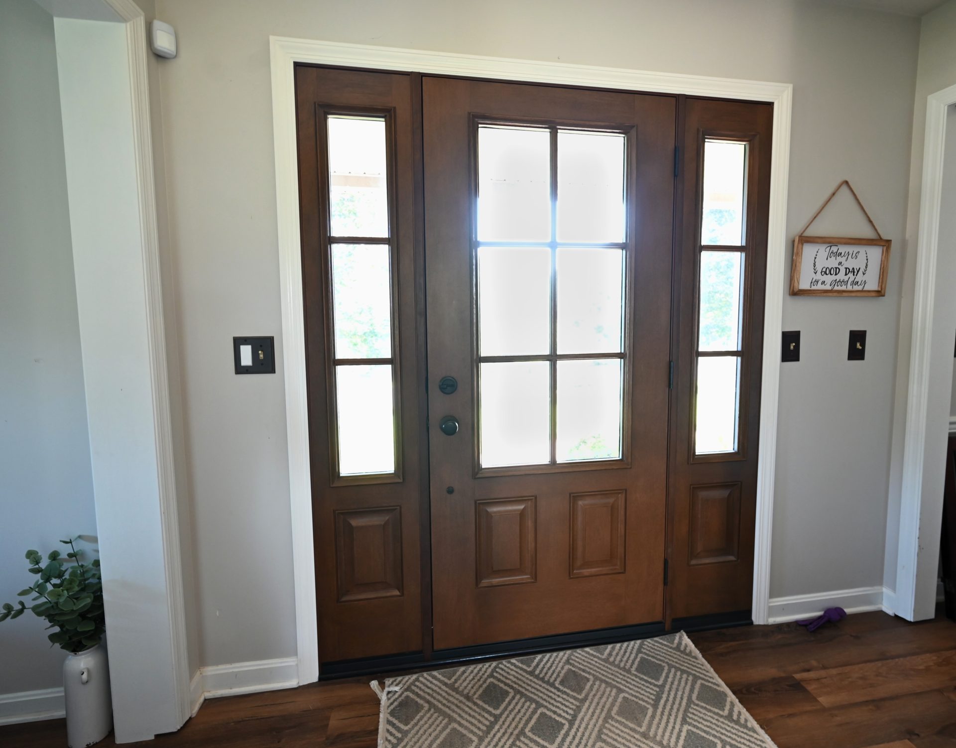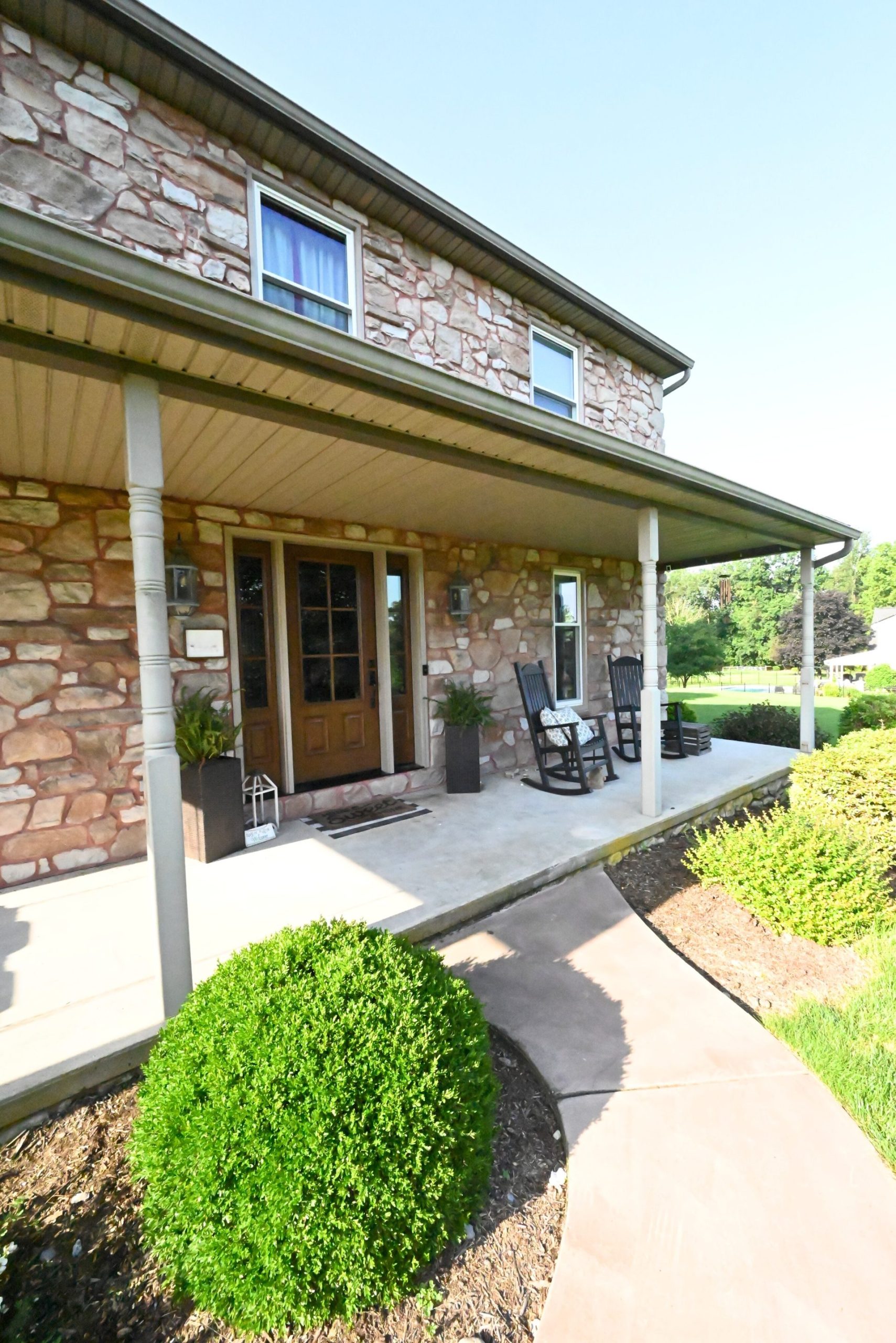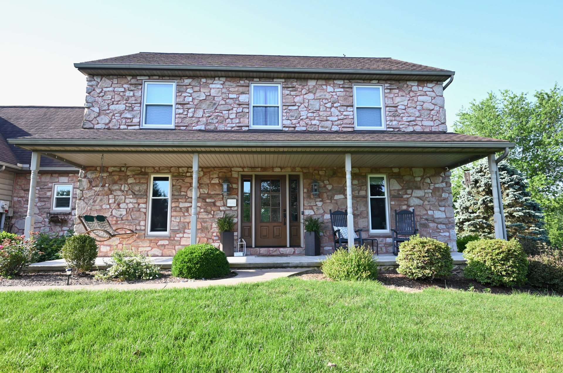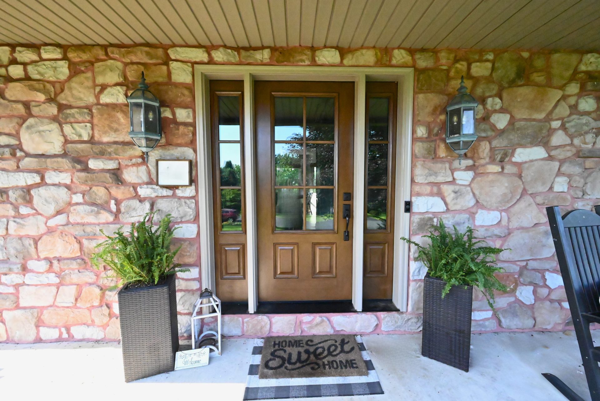 This project features the installation of a ProVia ‘Signet’ series entry door in mahogany woodgrain fiberglass. The original door was dark and provided limited natural light, while the new 3/4-light door with matching sidelites allows considerably more daylight into the entryway. Finished in a Natural Bark stain, the door complements the home’s unique stone color and offers the appearance of real wood combined with the durability and low maintenance of fiberglass.